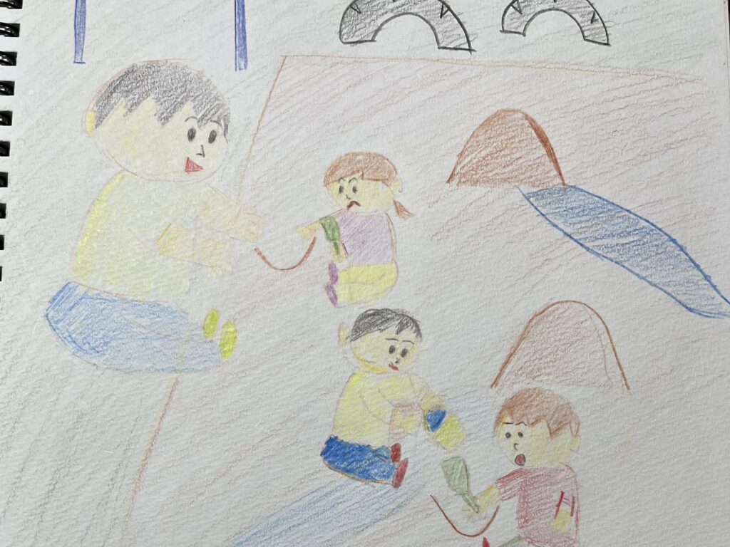 保育室の場合置いてある物品(おもちゃなど)や、地面などの色も決めていました。園庭もどのような遊具を配置するかなど決めました。殺風景だとどこだかわからないので、保育室や園庭とわかるような物品を用意しておきます(例:人形、本棚、ごみ箱、おもちゃ箱、時計、窓、積み木、鉄棒、タイヤ、ブランコ、木、砂場など)。例に書いた物品は描きやすいと感じ、保育室や園庭にありそうなものだと思います。
