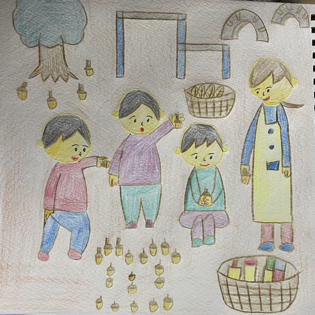保育士の性別や服装を決めていました。個人的にはエプロンを着用すると、保育士と判断しやすいのではないかと思います(ただし園庭ではエプロンはなくても可)。園児も服装や髪形などは決めていました。髪型や口の向きを変えるだけでも、3人すべて違う子どもに見えます。全く同じ表情や服装などの子どもは描かないように意識します(実際全く同じ人物はいないので)。ただし事例や条件に指定があればその通りに描いていきます。